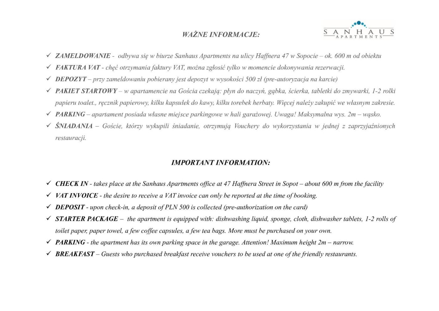 If you would like to receive an invoice for a prepaid stay, please enter this request and your companys details in the Ask a Question field before making payment.W obiekcie obowiązuje zakaz organizowania wieczorów panieńskich, kawalerskich itp.