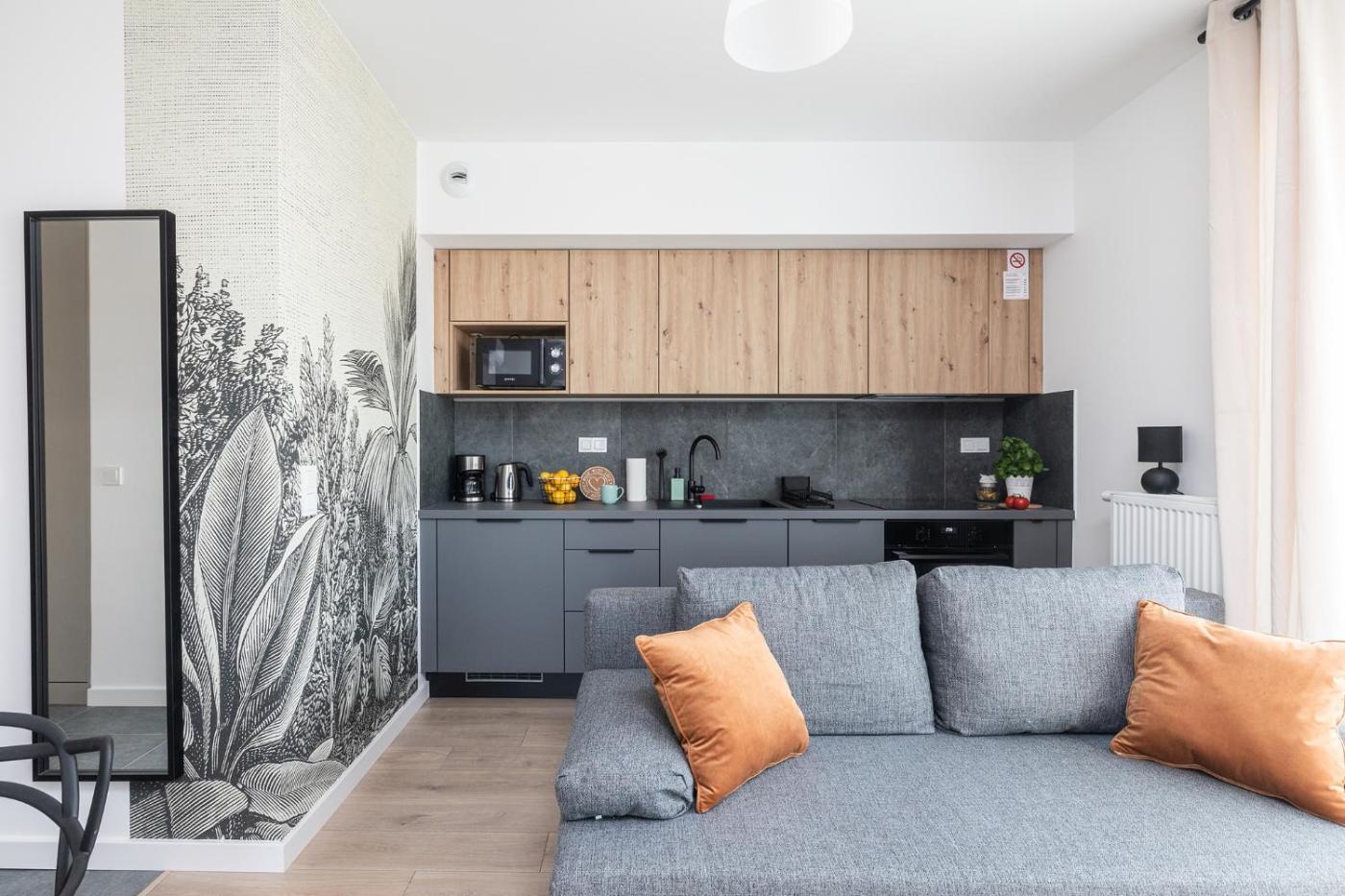 Studio z rozkładaną sofą. Meals can be prepared in the kitchen, which features a stovetop, a refrigerator, a dishwasher and kitchenware. The studio features a washing machine, a tea and coffee maker, a terrace with city views as well as a private bathroom boasting a shower. The unit has 1 bed. Studio - 2 osobowy. Powierzchnia pokoju ok.: 23 mkw.